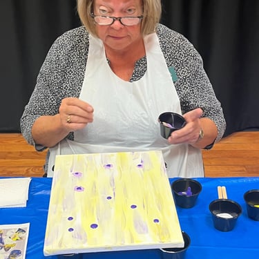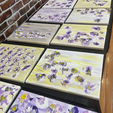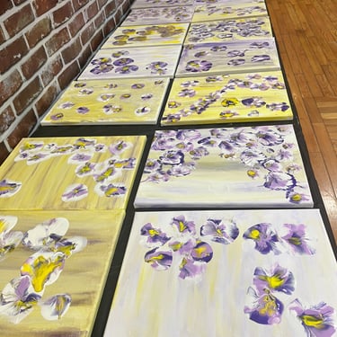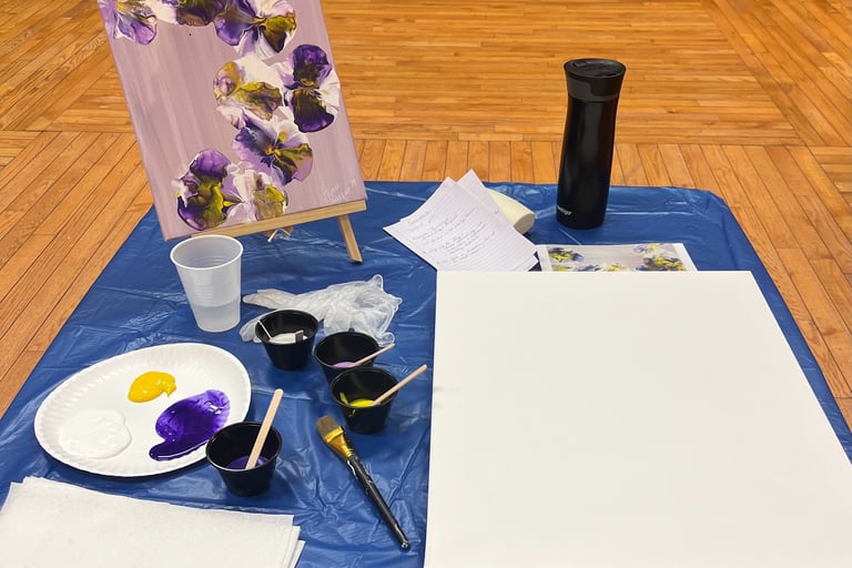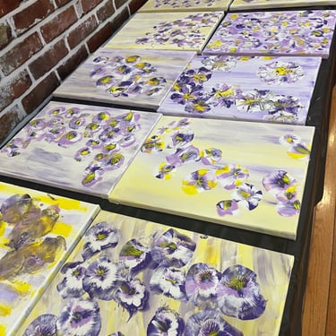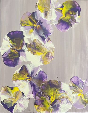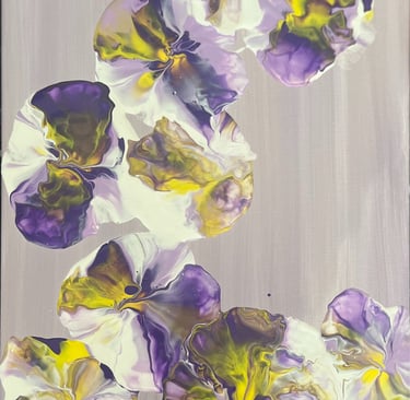 Now we'll use the fluid paints to begin laying in the puddles that will form the pansies. As you look at your canvas, think about how you would like the overall composition to look. I'm including a gallery of some layouts from a local class I taught to give you some ideas.