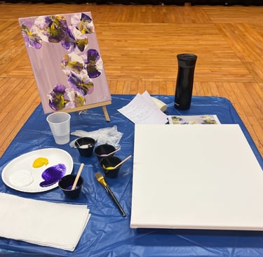 Set up your workspace having all your supplies ready to begin your painting process. The above picture shows everything we'll use for this painting. Not seen are what I used to raise the canvas off the work surface.