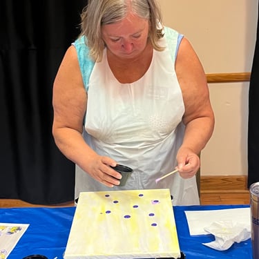 Start by using your stir stick to drop the dark purple in the pattern you chose. The overall puddle will be about 3" wide when you are done. So don't skimp here.