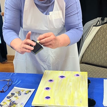 Next, you will begin pushing the main part of the glove over the puddles. This is light pressure, just pushing the paint. The hand part of the glove will create a beautiful pansy flower.