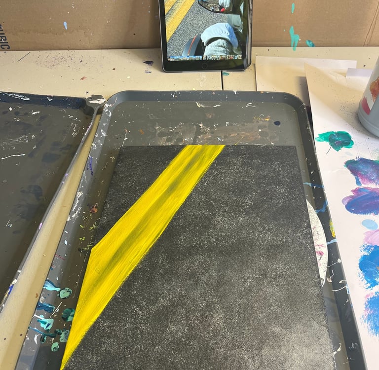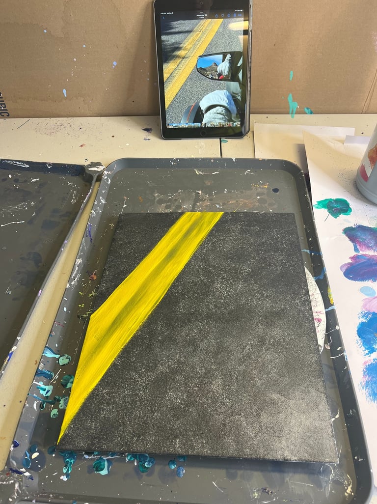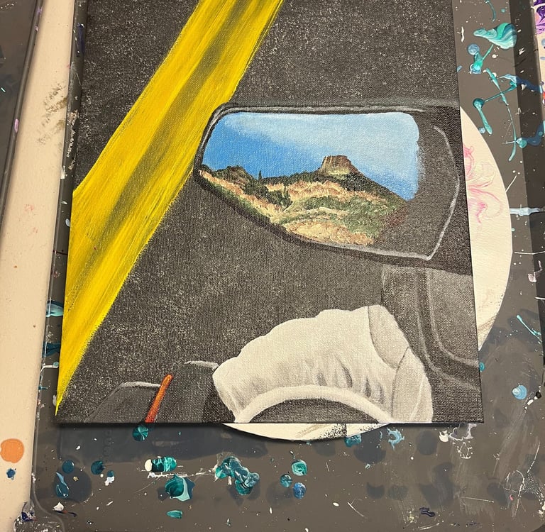 We purchased a three-wheeler (Spyder) in the autumn of 2022, and we have truly fallen in love with the adventures it brings. One of my favorite activities while riding is taking numerous pictures. The perspective is so different compared to traveling by car. As someone who loves to create art with a unique perspective, this should come as no surprise to those who follow my work. One day, as I happened to glance in the rearview mirror, I caught sight of the majestic mountains behind us. I immediately knew that I had to capture that moment so I could later paint it. It took several attempts to get just the right angles in the mirror, but the effort was worth it. It was an incredibly beautiful day as we drove towards Tortilla Flats in Arizona. By the way, do you enjoy witnessing the progression of a painting?